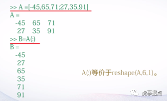A(:):将矩阵A中的每一列元素堆叠起来,成为一个列向量: