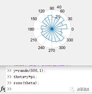 其中,参数theta用于确定每一区间与原点的角度,选项x用于指定区间的划分方式。绘图时将圆划分为若干个角度相同的扇形区域,每一扇形区域的高度反应落入该区间的theta元素的个数,若x为标量,则在0~2pi区间内均匀划分成x个扇形区域,x缺省时,默认按照20个缺省区间进行统计。