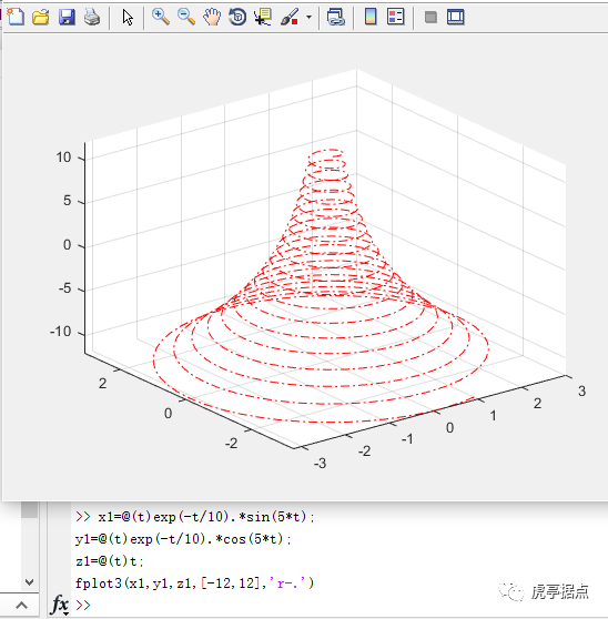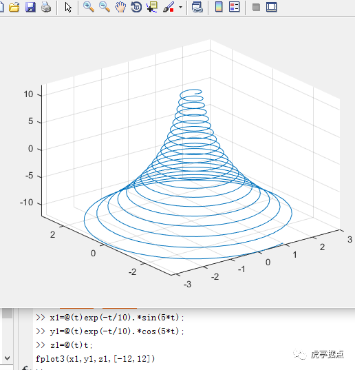 如果x,y,z坐标用参数方程定义,且参数方程只有一个自变量,则使用fplot3函数,其格式为: