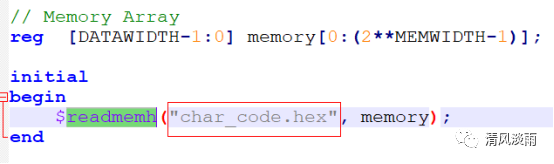 利用BRAM模块来储存字符点阵数据。利用 readmemh 函数加载字符点阵数据。
