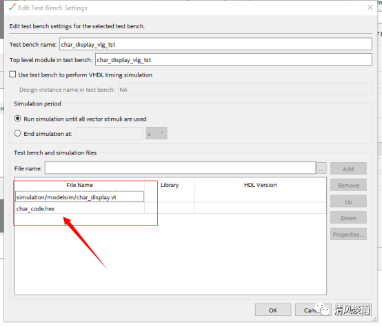 【注】本工程是利用quartus设置的仿真环境,在仿真设置时,最好将 char_code.hex 也添加进仿真文件列表中,仿真仿真软件找不到该文件。