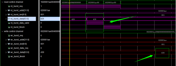 如下图,对应的是突发长度为1的写+读数据验证,先向设定的地址写入长度为1的数据,然后再读出该地址的数据。比较写入的数据和读出的数据是否一致。