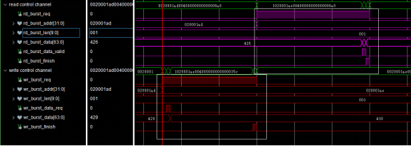 在WR_READY 信号为高或者接收到WR_DONE信号为高后,传输进入空闲状态,此时再启动一次突发传输。或在非空闲态就启动开始信号,将地址和传输长度放置在总线上,等到进入空闲态时,会自动进入下一次突发传输。