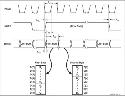 OV5640 在 HREF 信号为高时输出一行的图像数据,输出数据在 PCLK 的上升沿的时候有效。因为 RGB565 显示每个像数为 16bit, 但 OV5640 每个 PCLK 输出的是 8bit,所以每个图像的像数分两次输出,第一个 Byte 输出为 R4~R0 和 G5~G3, 第二个 Byte 输出为 G2~G0 和 B4~B0,将前后 2 个字节拼接起来就是 16Bit RGB565 数据。