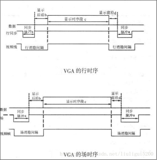 VGA的行时序可知:每一行都有一个负极性行同步脉冲(Sync a),是数据行的结束标志,同时也是下一行的开始标志。在同步脉冲之后为显示后沿(Back porch b),在显示时序段(Display interval c)显示器为亮的过程,RGB数据驱动一行上的每一个像素点,从而显示一行。在一行的最后为显示前沿(Front porch d)。在显示时间段(Display interval c)之外没有图像投射到屏幕是插入消隐信号。同步脉冲(Sync a)、显示后沿(Back porch b)和显示前沿(Front porch d)都是在行消隐间隔内(Horizontal Blanking Interval),当消隐有效时,RGB信号无效,屏幕不显示数据。