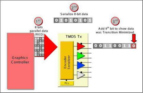 HDMI 采用和 DVI 相同的传输原理——TMDS(Transition Minimized Differential signal),最小化传输差分信号。