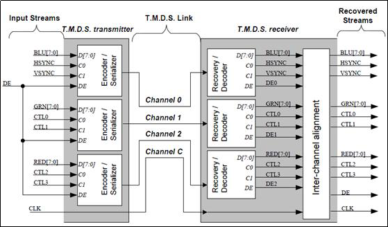 TMDS 传输系统分为分为两个部分:发送端和接收端。TMDS 发送端收到 HDMI 接口传来的表示 RGB 信号的 24 位并行数据(TMDS 对每个像素的 RGB 三原色分别按 8bit 编码,即 R 信号有 8 位,G 信号有 8 位,B 信号有 8 位),然后对这些数据进行编码和并/串转换,再将表示 3 个 RGB 信号的数据分别分配到独立的传输通道发送出去。接收端接收来自发送端的串行信号,对其进行解码和串/并转换,然后发送到显示器的控制端。与此同时也接收时钟信号,以实现同步。