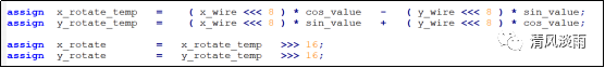 该正弦,余弦通过MATLAB计算得到,并预先储存到FPGA的片上储存空间中,在进行坐标变换时,读取对应角度的正弦,余弦值,进行坐标变换。由于计算得到的正弦和余弦值为浮点数,而FPGA擅长于进行整数运算。故要进行浮点数到整数的转换,具体的实现方法是,将计算得到的浮点正弦,余弦值乘上 256 后再取整,计算得到的结果于原结果相比被扩大了256倍,而在数字电路中,除法操作可以用移位来进行。结果右移8位即等效于除于256 。