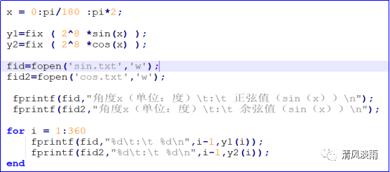 利用matlab生成正余弦表,并将其扩大256倍,打印到文件中。利用得到的正余弦表数值,将其写入verilog代码中,生成正余弦查找表。通过输入角度值来索引其正余弦数值。Matlab生成正余弦列表的代码如下;