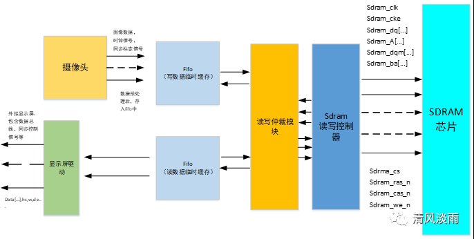 只有将图像数据临时储存起来,这样读写便互不所影响。当摄像头传来有效数据时,便将数据存入sdram,当显示屏需要数据时,便从sdram中读取数据,发送给显示屏用于显示。这样便可以将读写储存隔离。
