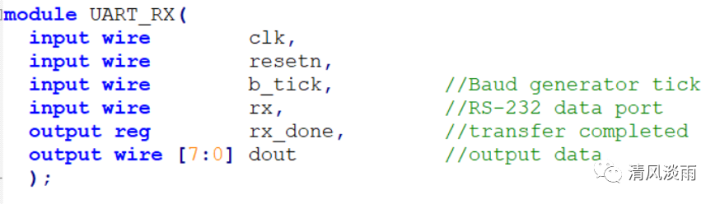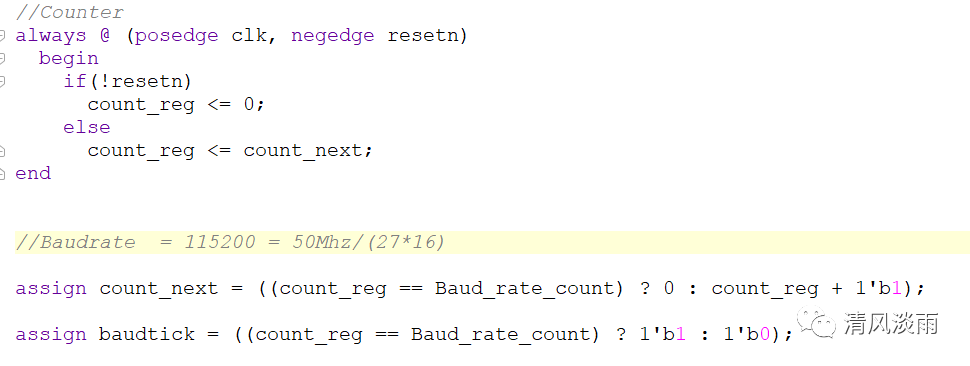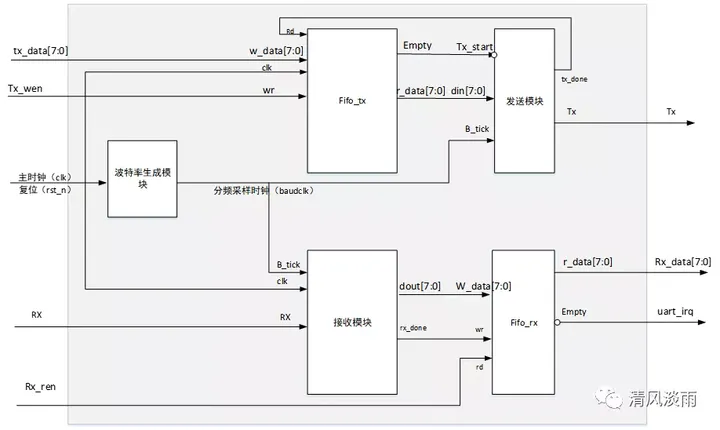 端口定义如下: 端口名方向描述ClkInput主时钟,默认频率为50MHzRst_nInput复位信号,低有效RsRxInput串口接收端口RSTxOutput串口发送端口Tx_data_in[7:0]Inputtx端要发送的1字节数据Rx_data_out[7:0]outputrx端口接收到的1字节数据Tx_wenInput发送数据的写入使能信号Rx_renInput接收数据的读取使能信号Uart_irqoutput串口中断信号,为高时标志着rx接收到了有效的数据该模块的使用: 发送数据: 将要发送的数据放置到Tx_data_in[7:0]总线上,同时将Tx_wen置为高,下一个时钟时,该数据会写进tx_fifo中。如要发送多字节数据,则重复上述步骤,每个时钟向TX_FIFO中发送一个字节的数据,tx_fiof的默认深度为256,可以储存256个字节的数据,则一次最多可以发送256字节数据。 接收数据: 接收到一个字节的有效数据时,该字节立即在Rx_data_out[7:0]端口输出,此时中断信号Uart_irq为高时,读取输出端口的数据,同时将Rx_ren置一个时钟的高电平即可 。 。 1,波特率计数模块在波特率生成模块中,生成发送和接收数据的采样时钟,该采样时钟为波特率的16倍频时钟。count_reg 是分频计数器。27为波特率设置为115200时的时钟分频参数。