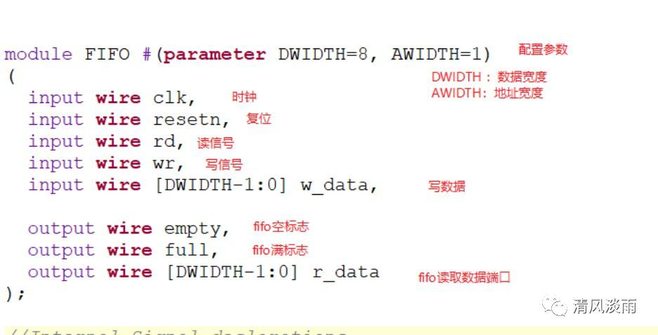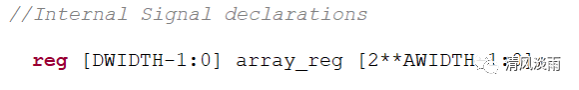 定义了一个名为array_reg的内存阵列,该内存阵列的储存深度由参数AWIDTH决定,储存的深度等于 2^AWIDTH.fifo的数据宽度等于DWIDTH。