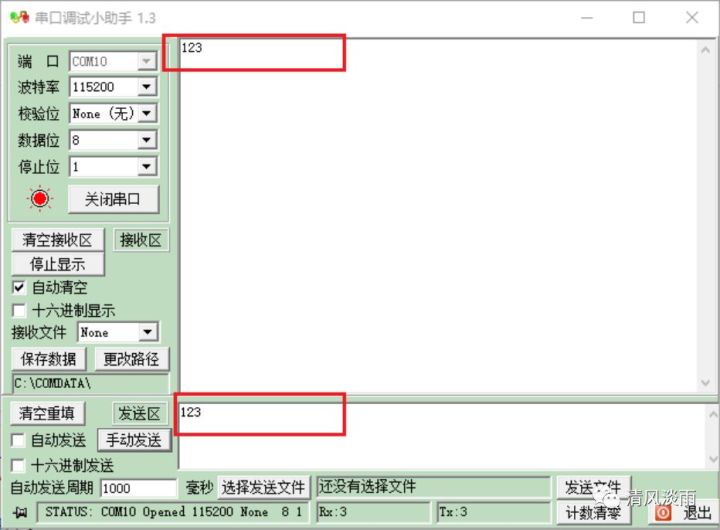 当该模块从rx端口接收到一个有效的字节数据后,rx_done会置高一个时钟,同时接收到的数据从端口dout[7:0]输出。rx_done连接到rx_fifo的写使能端口,接收到的数据将写入到rx_fifo中。 5,模块测试通过电脑端串口向FPGA发送数据,FPGA端RX模块接收到数据后再将该数据通过串口在发送到电脑端。 我们连续发送了字符串“123”,在接收端也同样接收到了字符串“123”。
