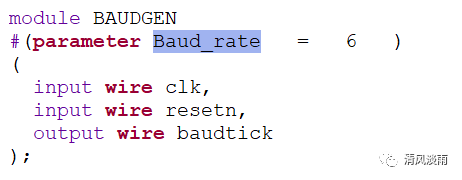 设置一个可配置参数 Baud_rate,便可以再顶层例化模块中通过该参数来改变串口的波特率。参数值和对应的波特率如下表所示。默认情况下,配置参数为6,对应的波特率设置为115200.