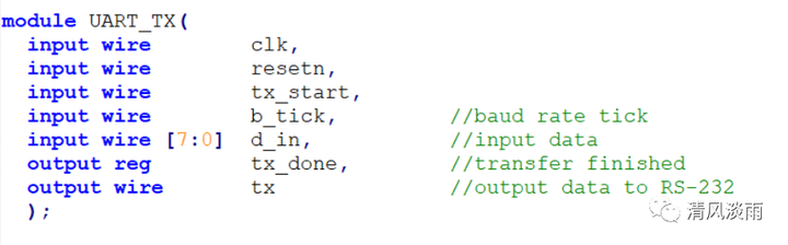 发送数据fifo: 要通过tx端口向其他串口设备发送数据,首先将要发送的数据放置到Tx_data_in[7:0]总线上,同时将Tx_wen置为高,下一个时钟时,该数据会写进tx_fifo中。如要发送多字节数据,则重复上述步骤,每个时钟向TX_FIFO中发送一个字节的数据,tx_fiof的默认深度为64,可以储存64个字节的数据,则一次最多可以发送64字节数据。当数据储存到TX_FIFO中后,fifo的空标志位(empty)不等于零,令发送模块的开发发送标志位(tx_start)等于 ~empty,则当fifo内储存有要发送的数据时,tx_start信号为1,此时,发送模块从TX_FIFO中读取一字节的数据。待这一字节的数据发送完成后,继续读取fifo内储存的下一个发送数据。直至将fifo内储存的数据全部读取完后,empty等于1,tx_start等于0,发送模块不再发送数据。 接收数据fifo: 当接收到rx端口的有效数据时,接收到的数据会临时储存在rx_fifo中,第一个字节的数据就会在Rx_data_out[7:0]端口输出。中断信号 uart_irq 时rx_fifo的空标志位的取反,此时中断信号 uart_irq 为高,标志这接收到了有效的数据。此时将Rx_ren置为高,读指针指向下一个数据的地址,在下一个时钟将输出下一个字节数据。连续将Rx_ren置为高,则可读出储存在rx_fifo中的接收到的数据,并从Rx_data_out[7:0]端口输出,直到fifo中的数据被读完。 故当tx_fifo里每接收到一个数据时,中断信号为高即标志着接收到了数据,同时在接收到的数据就在Rx_data_out[7:0]端口输出。如果每接收到一个有效数据就立即读取,则必须同时发送一个周期的Rx_ren高信号,使得读地址指针指向下一个读地址,以便当接收到新的数据时,也能立即输出。 如果等待接收多个字节的数据才读取的话,此时输出端口直接输出第一个字节的地址,当将Rx_ren信号置高时,每一个时钟输出一个接收到的数据,直到fifo中的数据被读完。 3,发送模块 发送模块的端口如下:
