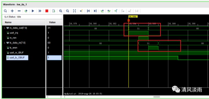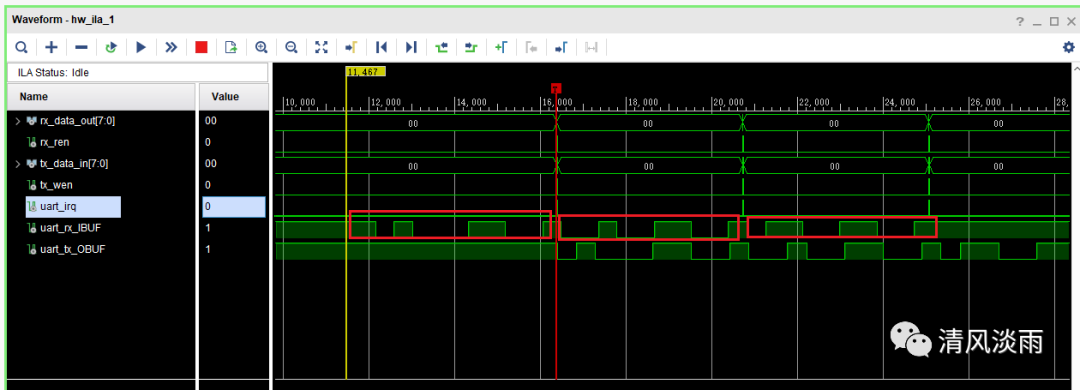 如下图,当接收到一个字节数据后,uart_irq信号会置高,同时接收到的数据就立刻在rx_data_out[7:0]端口输出。然后将rx_ren信号置高一个时钟,让读地址指针指向下一个地址,则当再次接收到一个新的数据时,该数据也能马上输出。