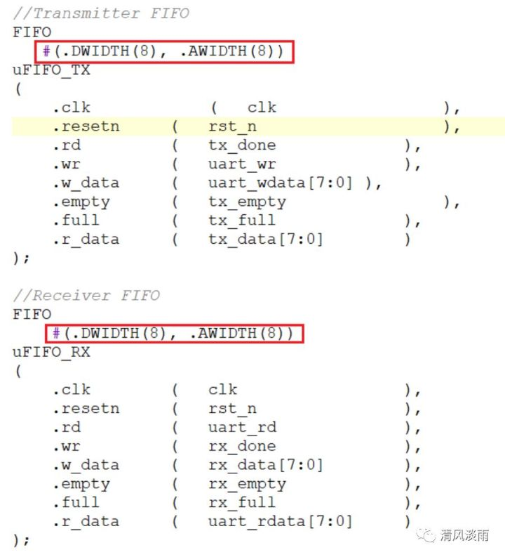 在串口模块例化该fifo模块时,将AWIDTH配置为8,DWIDTH也配置为8。即例化了一个数据宽度为8,储存深度为256的fifo模块。