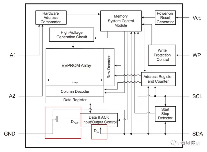 引脚名称描述NC不连接A1器件地址输出1A2器件地址输入2GND电源地VCC电源WP写保护。1:开启写保护,禁止写入,0:正常写模式SCL串行数据线SDA串行数据线如果A2,A1或WP引脚没有被外部驱动,它们在内部被拉到GND。 3,器件原理框图 从该器件的原理框图可以看出,该器件的SDA引脚是一个双向端口,并且输出端口为开漏输出,需要在引脚出接上上拉电阻才能输出高电平,组成线与逻辑。