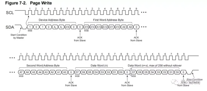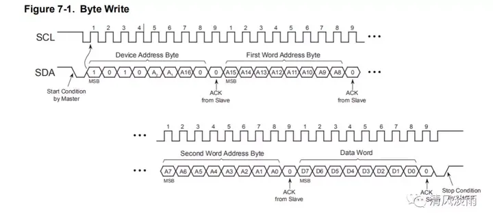 器件的操作与通信: IIC有一下操作状态: 空闲状态(IDLE):时钟和信号总线均为高。 开始信号(START):处理器让SCL时钟保持高电平,然后让SDA数据信号由高变低就表示一个开始信号。同时IIC总线上的设备检测到这个开始信号它就知道处理器要发送数据了。 停止信号(STOP):处理器让SCL时钟保持高电平,然后让SDA数据信号由低变高就表示一个停止信号。同时IIC总线上的设备检测到这个停止信号它就知道处理器已经结束了数据传输,我们就可以各忙各个的了,如休眠等。 数据传输:SDA上的数据只能在SCL为低电平期间翻转变化,在SCL为高电平期间必须保持稳定,IIC设备只在SCL为高电平期间采集SDA数据。 响应信号(ACK):单片机发完8bit数据后就不再驱动总线了(SDA引脚变输入),而SDA和SDL硬件设计时都有上拉电阻,所以这时候SDA变成高电平。那么在第8个数据位,如果外接IIC设备能收到信号的话接着在第9个周期把SDA拉低,那么处理器检测到SDA拉低就能知道外接IIC设备数据已经收到。IIC数据从最高位开始传输(小端传输)。 非应答信号(NAK):在连续读数据时,当读取完最后一个字节数据时,从机不产生响应信号。 该芯片支持字节写入和页写入(一次连续最多写入256个字节),字节写入的时序如下图所示,每写完成一个字节,从机都会有一个响应信号. 1,字节写入时序: