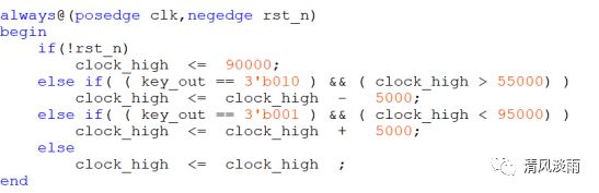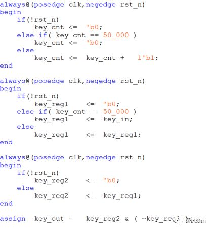 用一个1ms的计数器,用来1ms接收一次按键的输入值,达到按键消抖的目的。key_cnt用于1ms计数器。key_out为消抖后的按键的输出值。