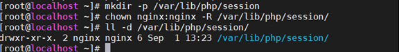 在/var/lib目录下为session路径创建一个新的文件夹,并将用户名和组设为nginx