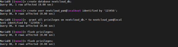 grant all privileges on nextcloud_db.* to nextcloud_yan@localhost identified by '123456';
