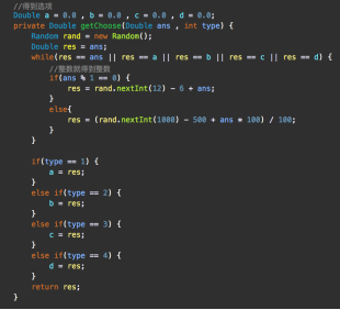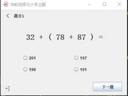 - 答案匹配过程中需要查重,因此用4个变量记录4个选项,同时更新选项只,保证3个选项与答案不同,且互不相同。同时若算术答案明显为整数,则选项均为整数。同时在生成答案时检测浮点数的形式,选项最多保留两位小数。
