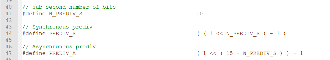宏 N_PREDIV_S 定义了同步预分频的位数,即同步预分频寄存器的重装载值为2^10-1,即得到宏 PREDIV_S。