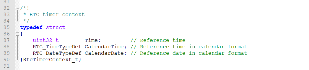 RtcTimeContext_t 对象由 uint32_t RtcSetTimerContext( void ) 函数更新。返回32位的同步异分频计数器的总计数值。