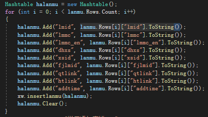 xw.insertlanmu(halanmu); 这个是执行sql的,因为hashtable只有一行数据,所以我采用的是循环的方式存数据库(如果有更好的方法的话可以评论一下,谢谢)