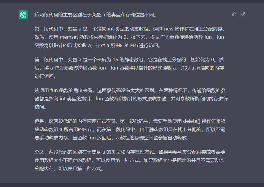 总之,两段代码的区别在于变量 a 的类型和内存管理方式。如果需要动态分配内存或者需要使用数组大小不确定的数组,可以使用第一种方式。如果数组大小是固定的并且不需要动态分配内存,可以使用第二种方式。