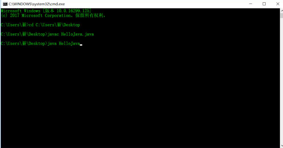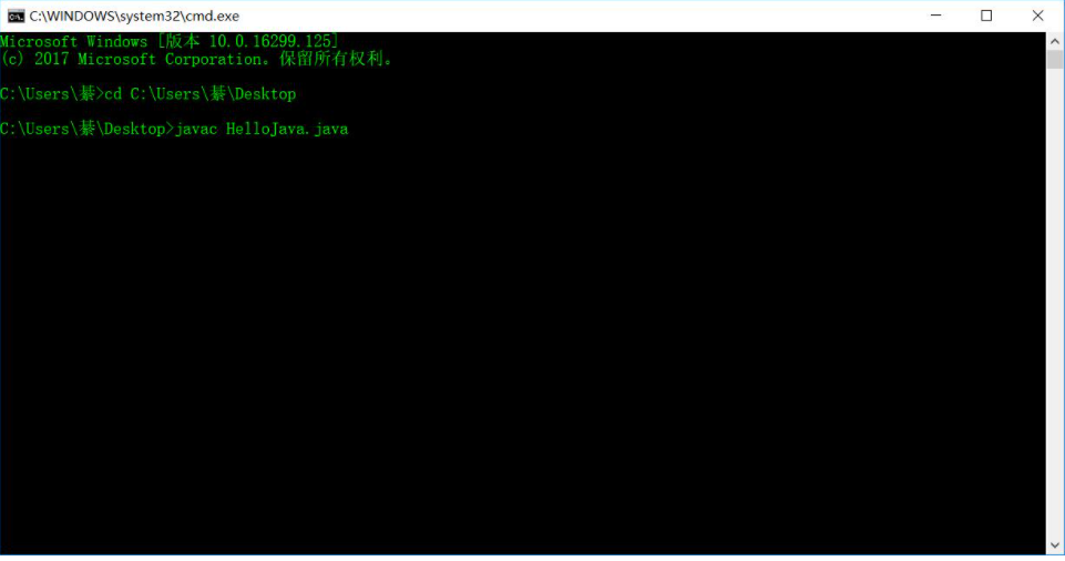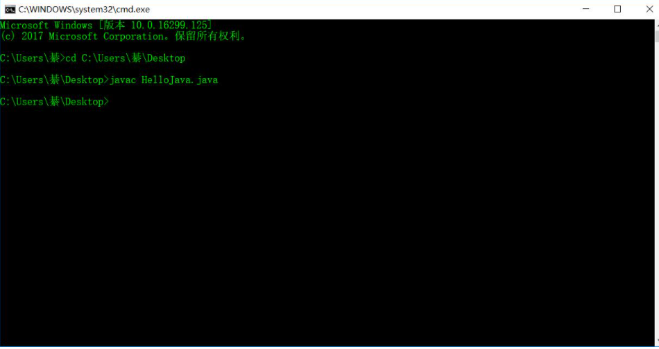 **现在我们已经在桌面文件夹了,接下来我们使用javac命令来生成可在命令行执行的.class文件,如图: