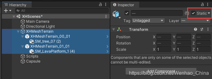 ①:首先把要烘焙的地形图和他们下边的物体勾选静态