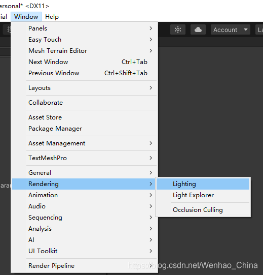 ③:打开灯光设置:Window -> Rendering -> Lighting