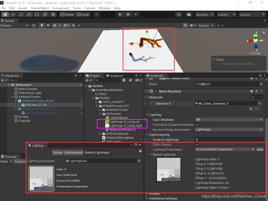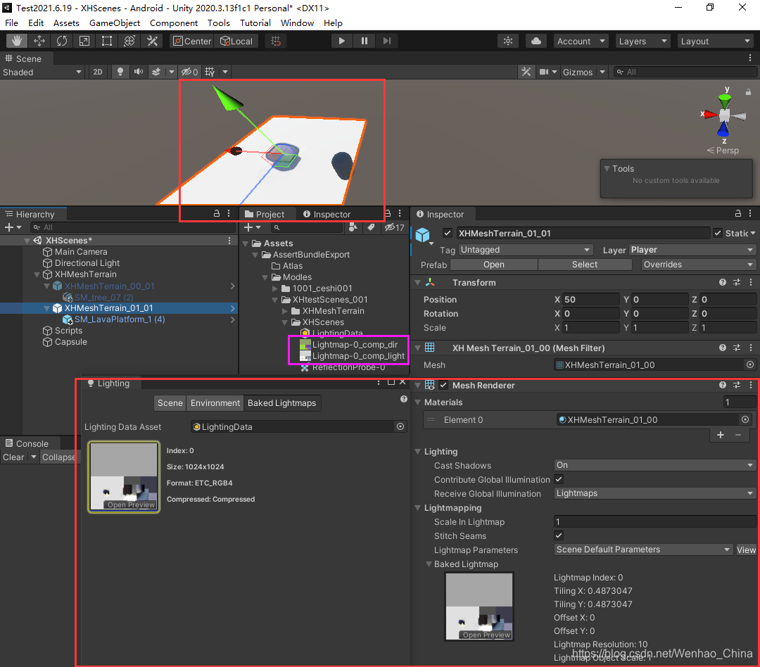 ⑤:这时候我们要做一件大事儿!先记录烘焙完成后光照贴图对于物体的偏移量和缩放值等等记录一下,然后再把图中粉框标记的内容,连带着他们的.mate文件全部移到Unity外边,后边要用到,所以要保存好!