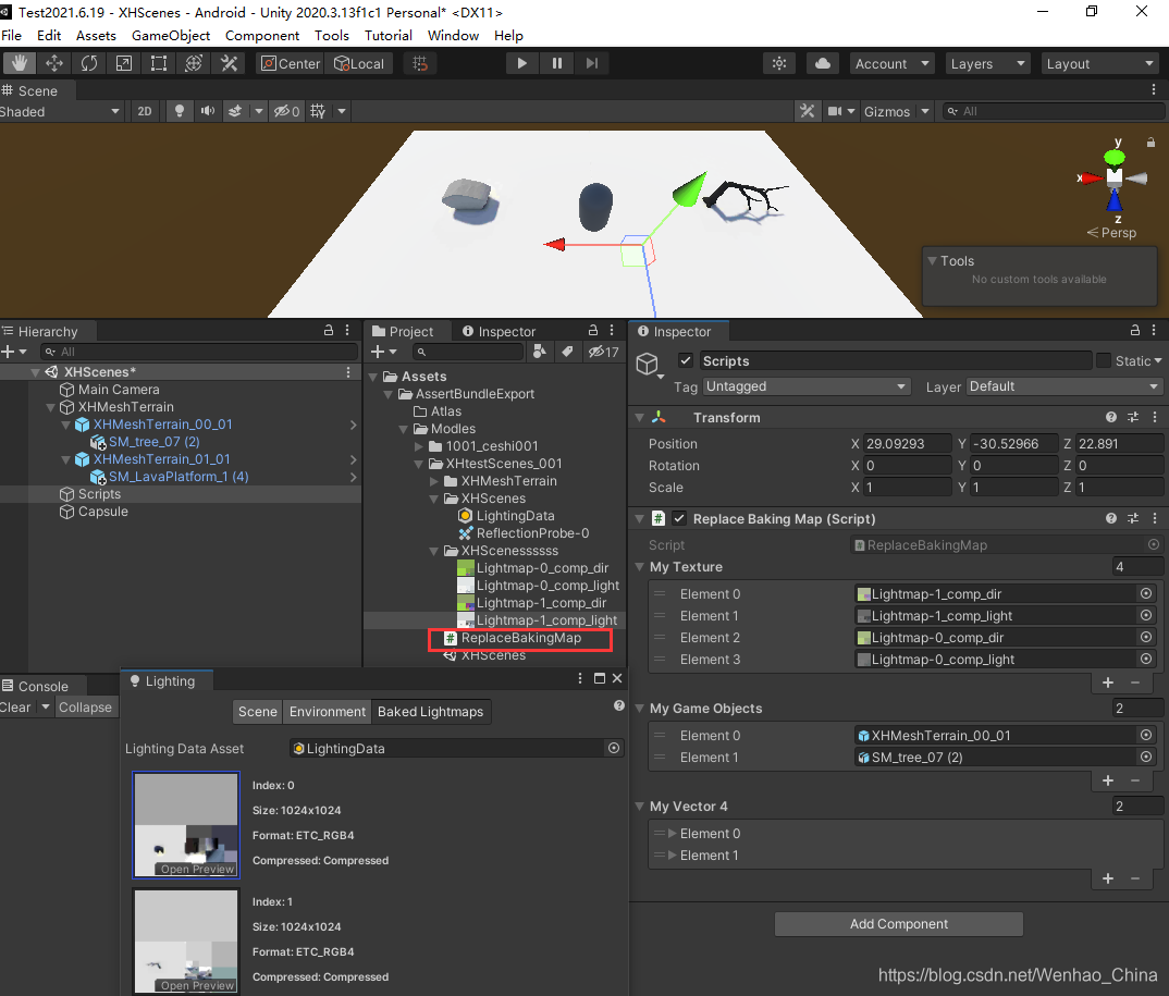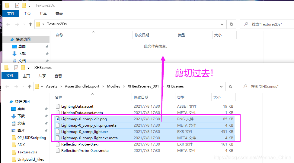 ⑦:接着我们不能进行Clear清除操作了啊。因为我们要用到他们共同的LightingData和ReflectionProbe-0。接着我们把两次烘焙出来的内容,全部放入Unity的一个自定义文件夹中,可以从下边看出,小黑是把两次烘焙的结果全部放到了一个叫XHScenessssss文件夹下,并且把第二次烘焙出来的贴图索引改名为1。