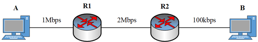 1. 如下图所示网络,主机A通过路由器R1和R2连接主机B,三段链路带宽分别是100kbps、2Mbps和1Mbps。假设A以存储-转发的分组交换方式向B发送一个大文件。