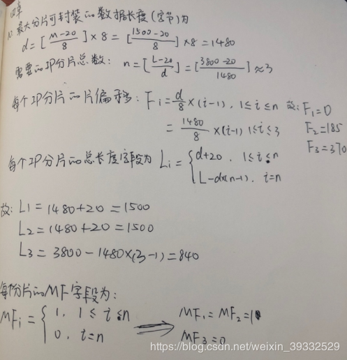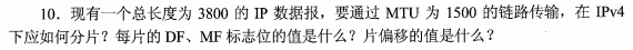 (3)若主机192.168.1.10向互联网ID=6789、length=1500B、DF=0的IP分组时,路由器需要将该IP分组分为几片(每片尽可能封装为最大片)?给出分片结果,包括每片的ID、DF、MF、length、offset的取值。**