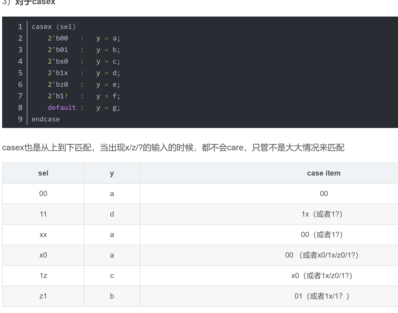 在casex语句中,则把这种处理方式进一步扩展到对x的处理,即如果比较双方有一方的某些位的值是z或x,那么这些位的比较就不予考虑。