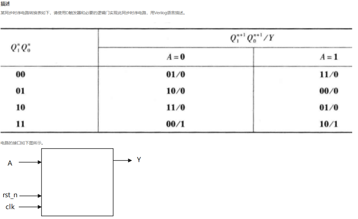 根据给的状态转移表知道有两个状态:第一列的为current_state,第二三列为next_state,且仅当current_state==11时候Y为1(使用()?:语法实现)。