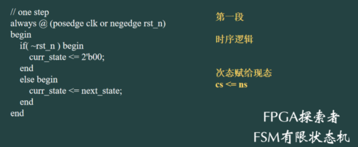 第三段:三个always块,一个always模块采用同步时序描述状态转移;一个always采用组合逻辑判断状态转移条件,描述状态转移规律;第三个always块使用同步时序描述状态输出,寄存器输出。。优点:三段式寄存器输出,不产生毛刺,有利于时序约束