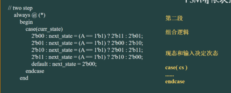 第二段:组合逻辑,这里要注意always @(*)是固定写法,不能像第一段写成时序。第二段写的是状态转移表,使用()?:语法实现。