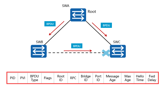 当现有根桥产生故障时,非根桥之间会交互信息并重新选举根桥,交互的这种信息被称为BPDU。BPDU中包含交换机在参加生成树计算时的各种参数信息。