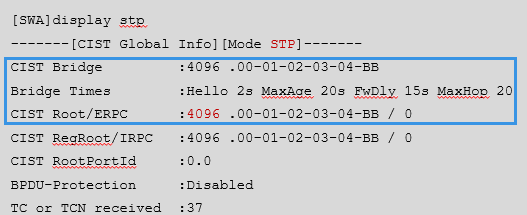 Bridge Times参数标识Hello:BPDU发送的周期。MaxAge:BPDU的最大生存期。
