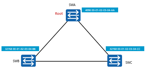 STP使用STA(Spanning Tree Algorithm,生成树算法)来决定交换机上的哪些端口被堵塞用来阻止环路的发生,STA选择一台交换机作为根交换机,称作根桥(Root Bridge),以该交换机作为参考点计算所有路径。