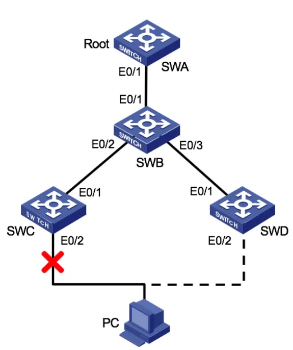 图中,SWA是根桥,正常情况下,PC连接在SWC的E0/2端口。