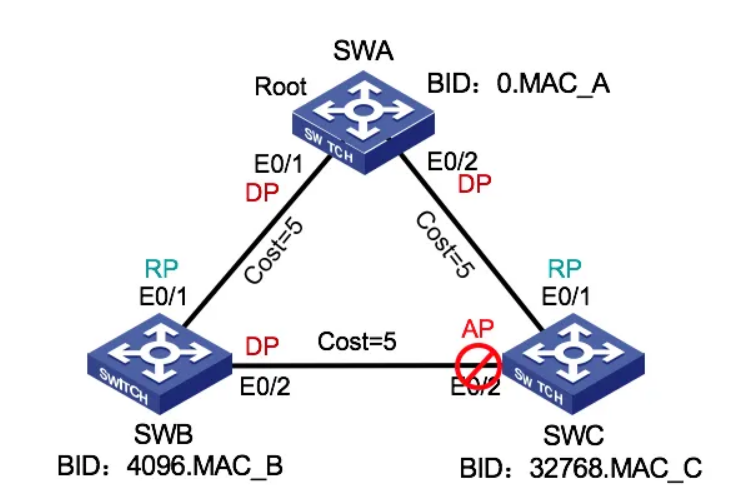 SWC收到一看笑了,优先级4096也想当根桥?不知道还有个SWA啊。于是E0/2端口状态由Blocking变成Listening,角色由AP变成DP,把根桥SWA的BPDU转发出去。SWB收到后,原来SWA还在啊,老老实实把E0/2端口变成RP。SWC的E0/2端口经过30秒延时后,状态迁移到Forwarding。
