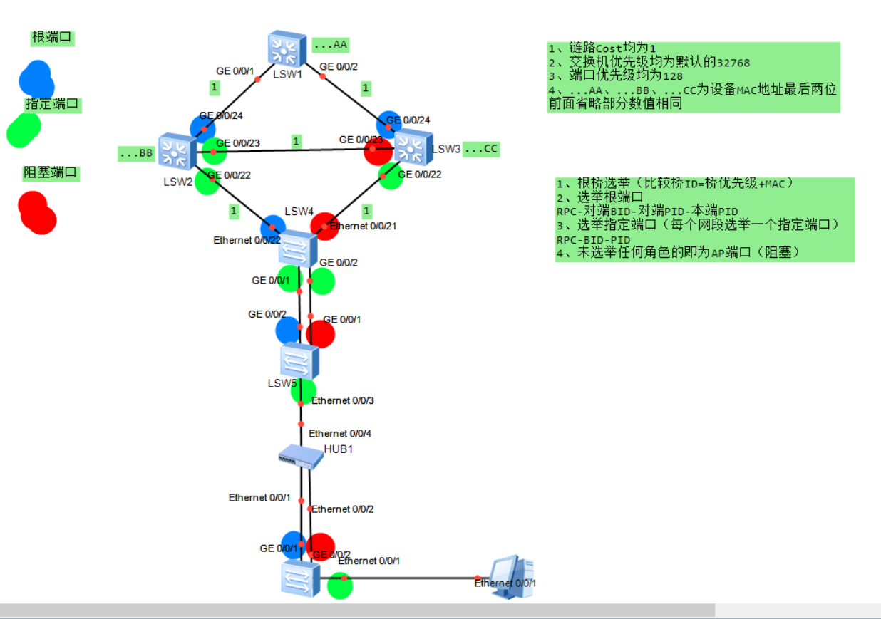 网络收敛后,只有指定端口和根端口可以转发数据。其他端口为预备端口,被阻塞,不能转发数据,只能够从所连网段的指定交换机接收到BPDU报文,并以此来监视链路的状态。