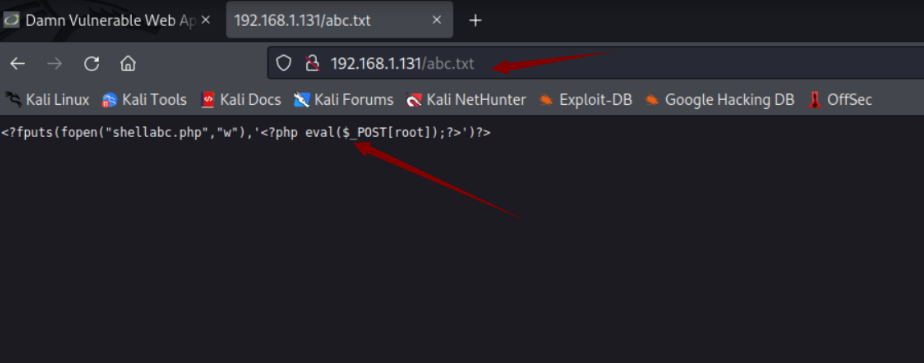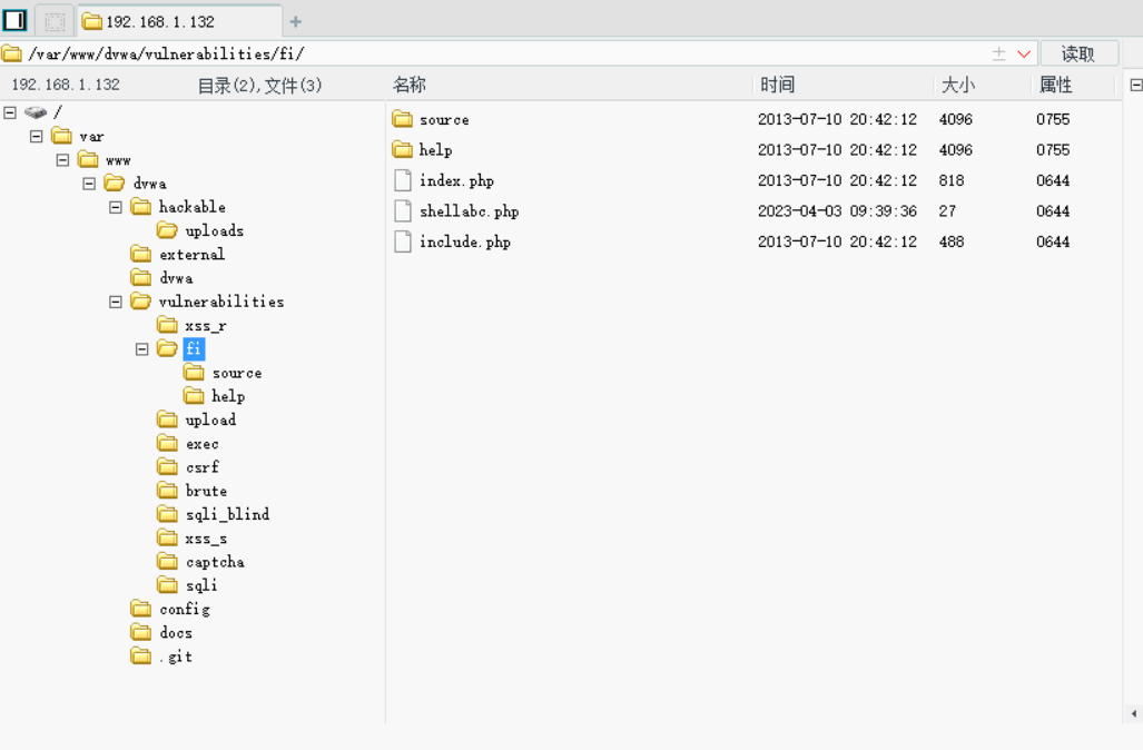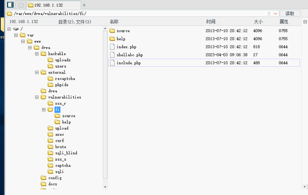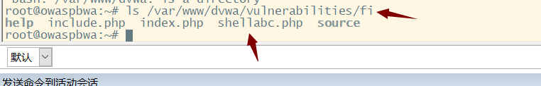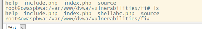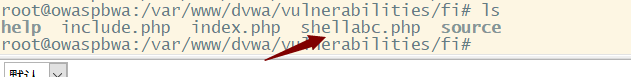 可以看到在/var/www/dvwa/vulnerabilities/fi目录下有了shellabc.php这个文件